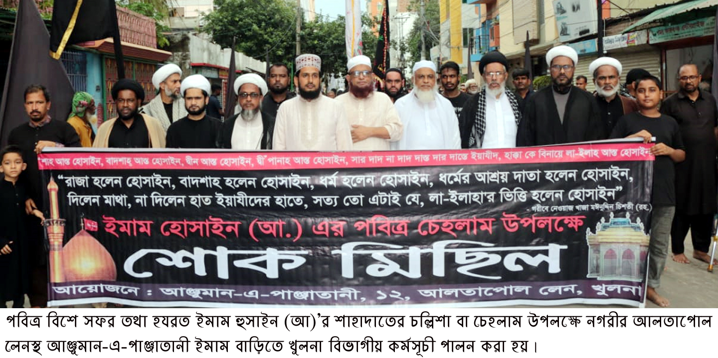 পবিত্র বিশে সফর তথা হযরত ইমাম হুসাইন (আ)’র শাহাদাতের চল্লিশা বা চেহলাম বার্ষিকী। হযরত ইমাম হোসাইন (আ.)’র পবিত্র চেহলাম উপলক্ষে ২৭ আগস্ট মঙ্গলবার বিকাল ২টা ৩০ মিনিটে নগরীর আলতাপোল লেনস্থ আঞ্জমান-এ-পাঞ্জাতানী ইমাম বাড়িতে খুলনা বিভাগীয় কর্মসূচী পালন করা হয়। কর্মসূচীর মধ্যে ছিল আলোচনা সভা এবং শোক ও মাতম মিছিল।