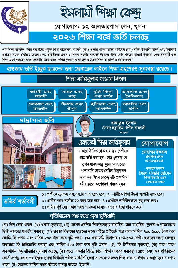 ইসলামী শিক্ষা কেন্দ্র, খুলনা । ২০২৬ শিক্ষাবর্ষে ভর্তি চলছে